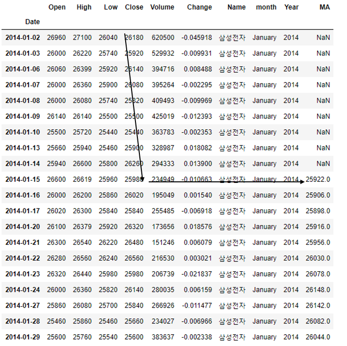 20개의 데이터를 불러봤는데 보면 앞의 9개는 10개가 안 되므로 mean을 구할 수 없어서 NaN으로 처리 됩니다.