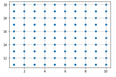 점의 위치를 scatter로 보면 meshgrid가 무엇을 하는지 알 수 있습니다.