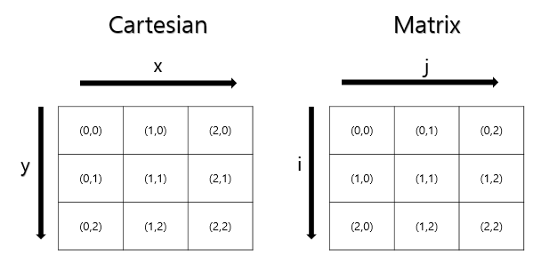 카테시안은 x는 가로, y는 세로로 보고 행렬은 i가 세로, j는 가로로 봅니다.