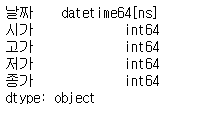 지금 df 같은 경우 날짜만 datatime64[ns] 이고 나머지는 int64 입니다.