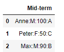 df = pd.DataFrame({'Mid-term': ['Anne:M:100:A', 'Peter:F:50:C', 'Max:M:90:B']})