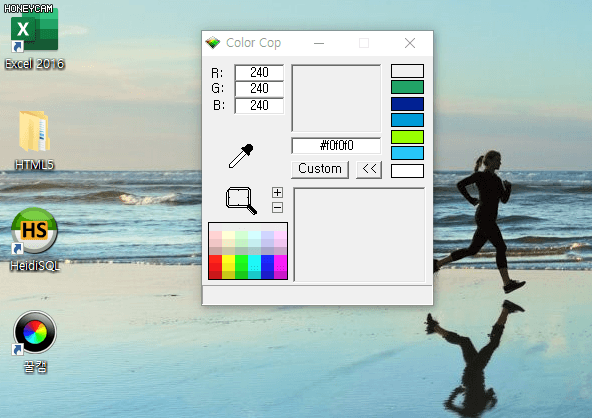 스포이드를 클릭한후 드래그해서 원하는 색상에 놓으면 알아서 코드와 RGB좌표를 알려준다.
