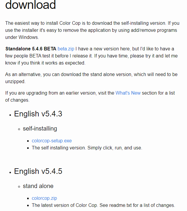 The easiest way to install Color Cop is to download the self-installing version. If you use the installer it's easy to remove the application by using add/remove programs under Windows. Standalone 5.4.6 BETA beta.zip I have a new version here, but I'd like