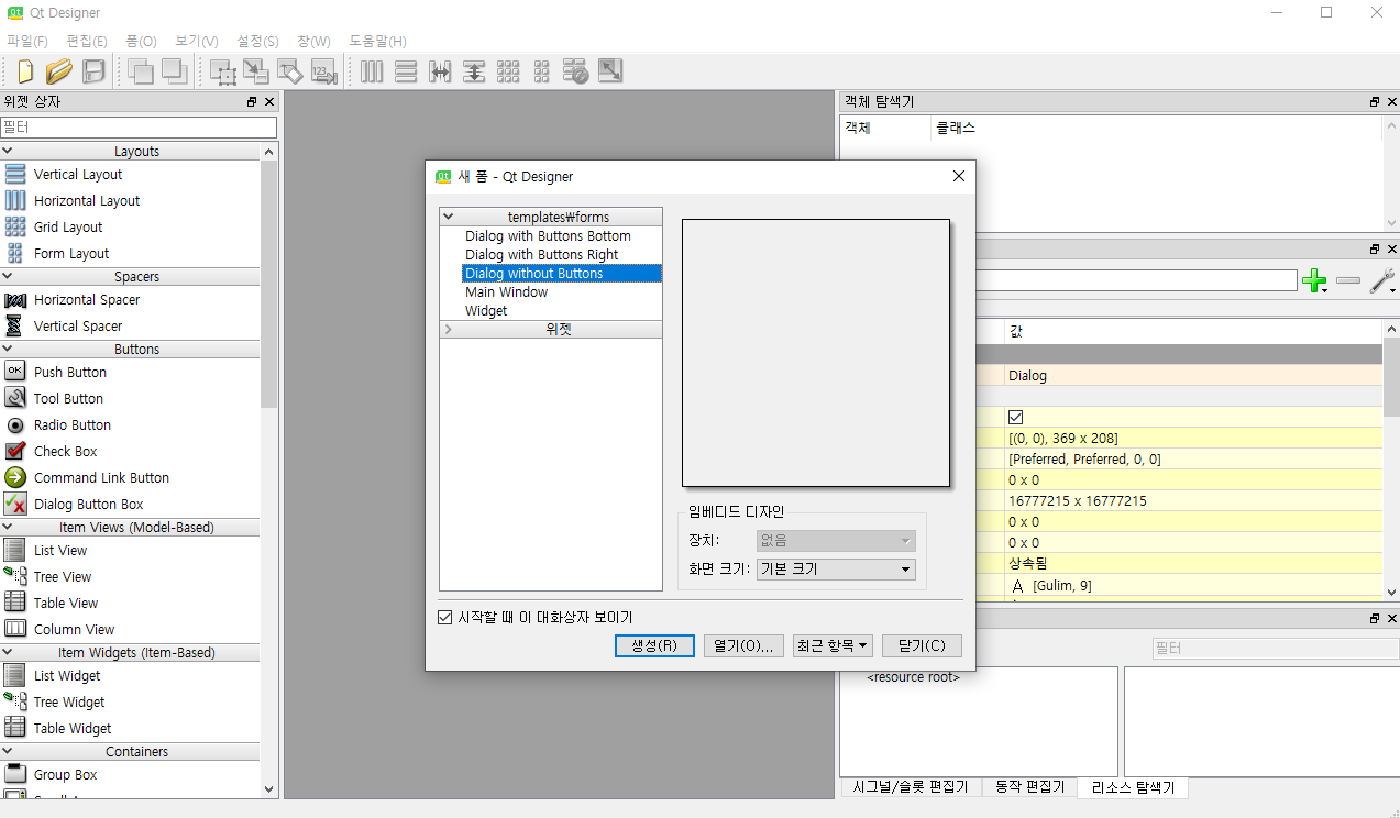 - Dialog without Buttons : 버튼이 없는 빈 창이 생성됩니다.