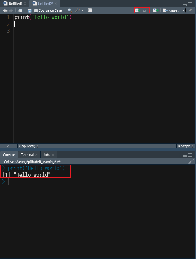 코드 실행을 하려면 코드 줄에 커서를 위치하고 Ctrl+Enter를 누르거나 Run을 누릅니다. Console 창에서 결과가 나옵니다.