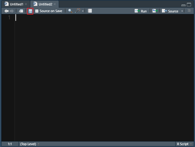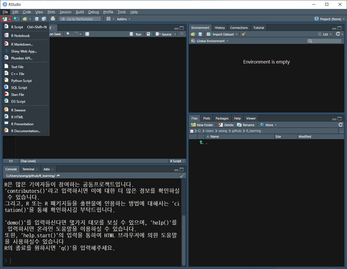 여기서 R script를 누르면 코드를 쓸 수 있는 편집기가 나옵니다.
