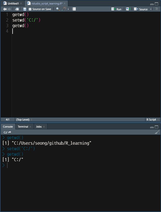 위치를 바꾸려면 setwd('경로') 를 입력합니다.