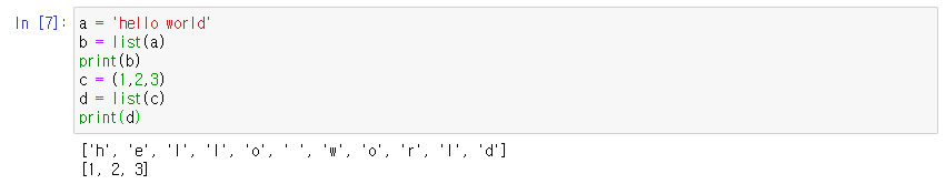 list를 생성할 때는 문자열에 있는 것을 리스트로 가져올 수 있고 튜플도 가능합니다. (튜플은 생성할 때 ()로 생성합니다)