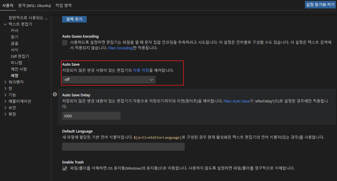 - after delay: Auto Save Delay에서 설정한 시간이 지난 경우 자동저장