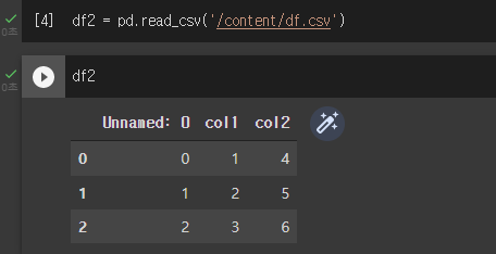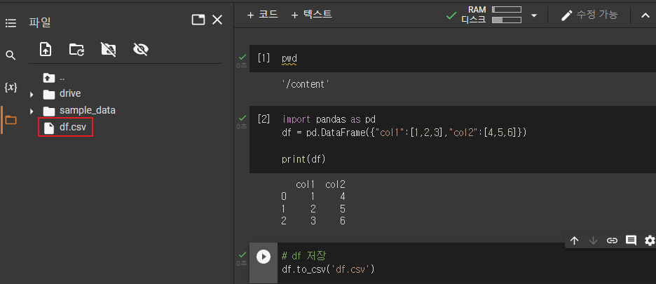 df.csv 파일이 생깁니다. 하지만 content 폴더는 colab을 다시 켜면 리셋이 되기 때문에 이대로 colab을 끄면 df.csv가 사라집니다. 따라서, 앞으로도 계속 쓸 파일이라면 파일을 끌어다 Mydrive 안으로 옮겨넣습니다.