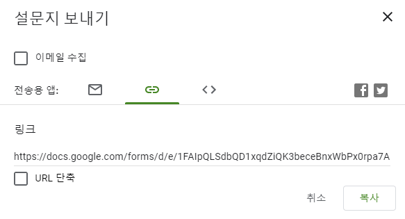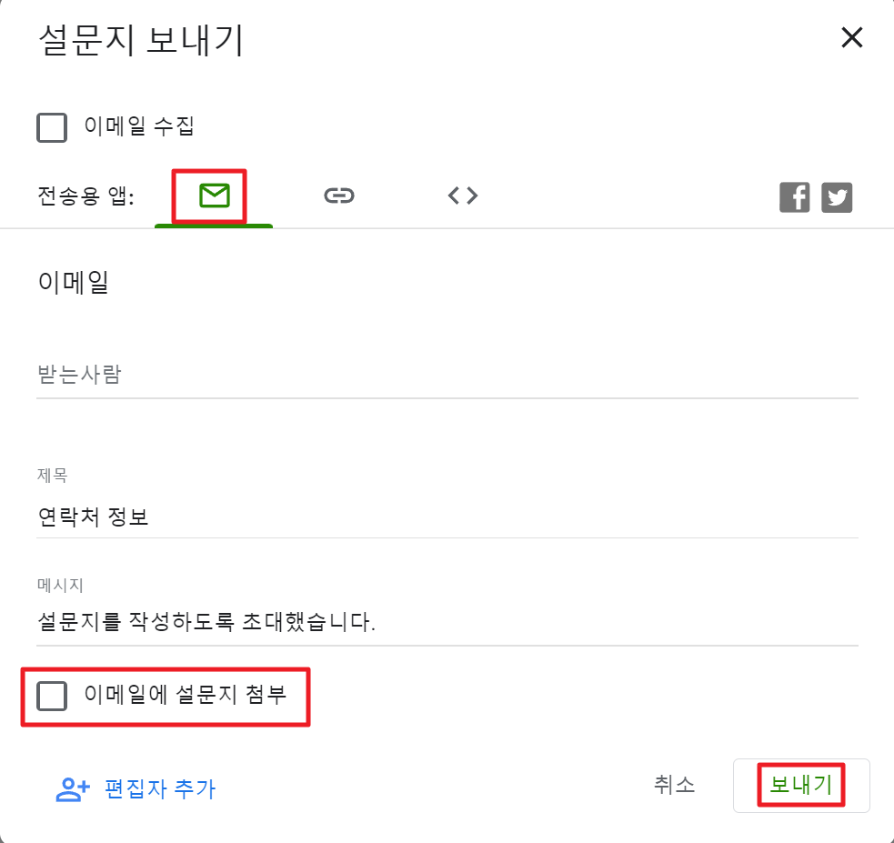 어느정도 만들어지면 설문지를 보내기를 통해 외부로 보낼 수 있습니다.