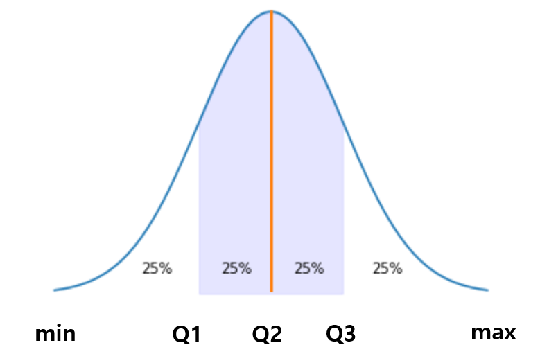 - 제2사분위수(Q2) : 전체 데이터를 사등분했을 때 2번째에 해당하는 수, 50% 지점에 해당하는 수로 중간값(median)과 동일