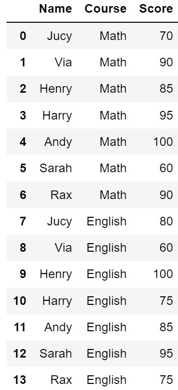 obj = {'Name':['Jucy','Via','Henry','Harry','Andy','Sarah','Rax'], 'Score':[90,80,85,95,90,100,80]}