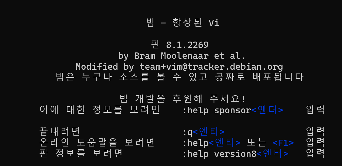 vi를 켜보면 한글로 바뀐것을 알 수 있습니다.