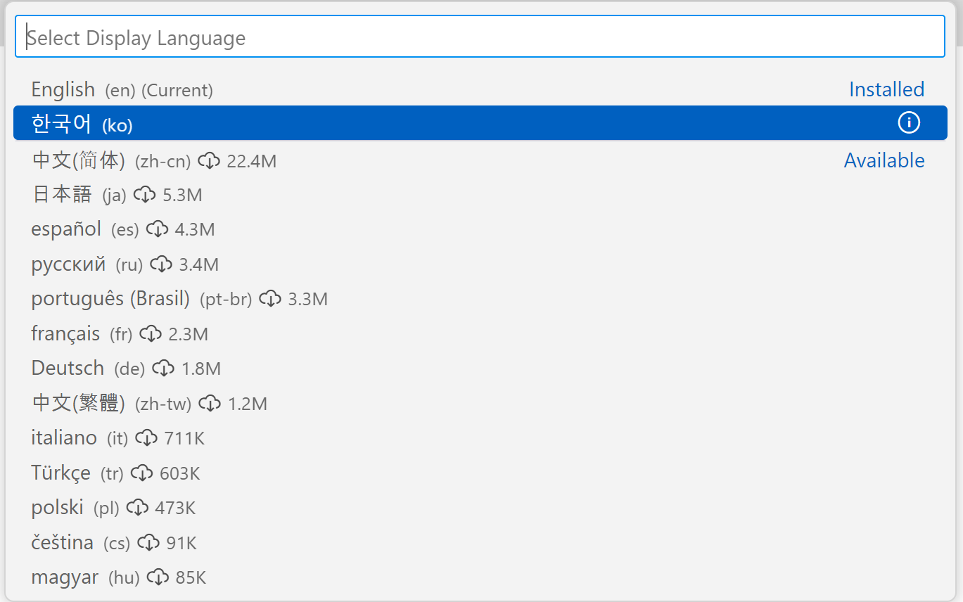 예전 버전에서는 extension으로 넘어가서 언어팩을 받았는데