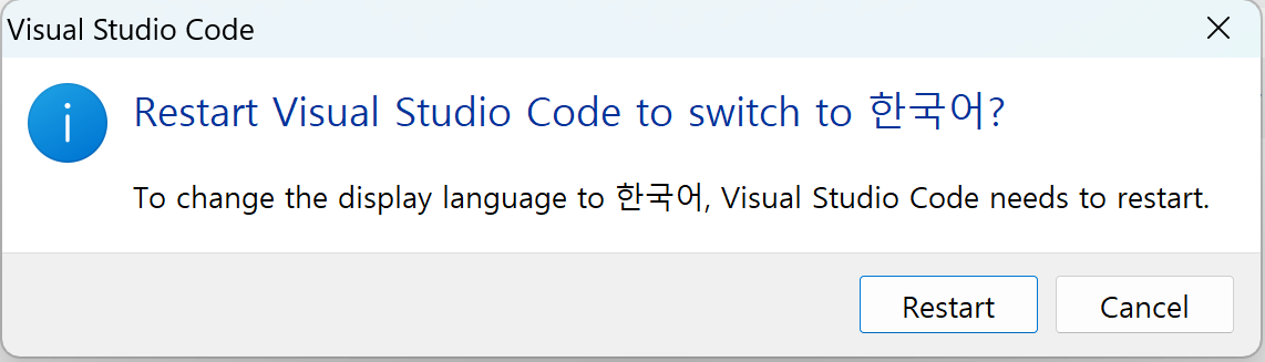원하는 언어를 클릭하면 다음과 같이 재시작해야한다고 나옵니다.