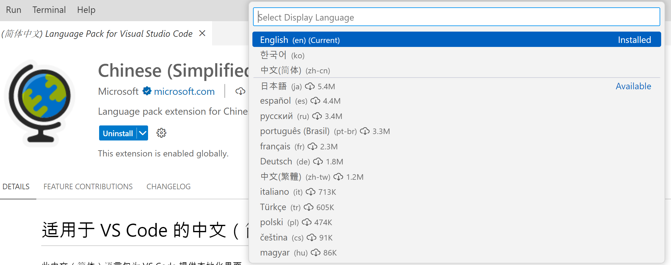 화면과 같이 Chinese 설치 extension으로 화면이 바뀌고 설치가 되네요.