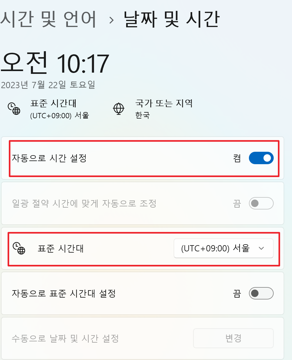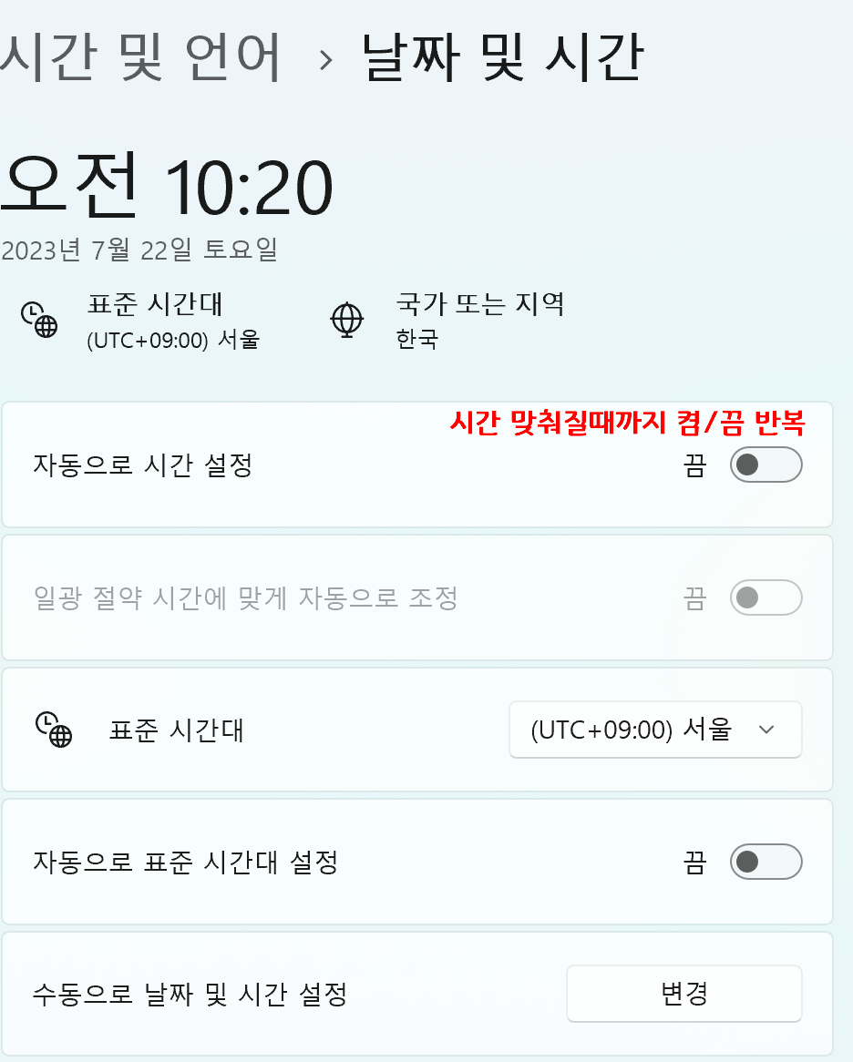 윈도우 검색에서 시스템 - 시간 및 언어- 날짜 및 시간을 들어갑니다,
