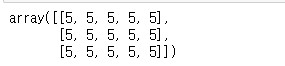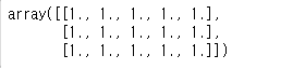 np.ones의 가로안에 튜플로 숫자를 입력합니다. (3,5)는 3열의 5행을 뜻합니다. 가로를 먼저 쓰고 세로를 뒤에 씁니다.