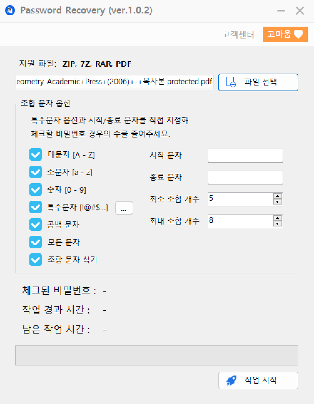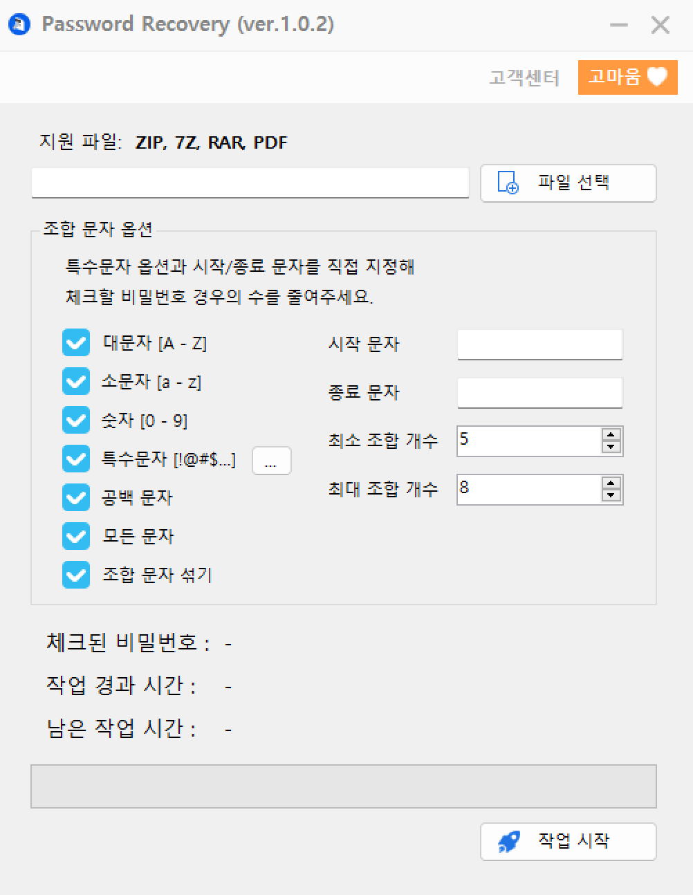대문자, 소문자, 숫자, 특수문자, 공백, 조합 문자 섞는 것까지 모든게 가능합니다. 단, 이 조합을 다 사용하게 하면 할수록 오래걸립니다.