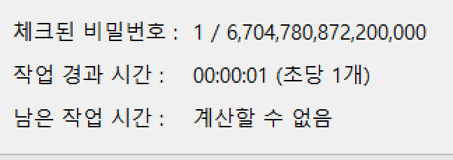 예전에 시험삼아 하나 했다가 200일걸린다고 뜨길래 중단했던 기억이 나네요. 200일 걸리면 200일동안 컴퓨터를 켜놔야하기때문에 사실상 암호를 찾는 건 불가능해집니다.