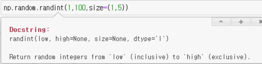 randint는 low,high, size,dtype 으로 되어있네요. 위의 코드는 설명대로 작성됐다면 1에서 100중에 size=(1,5)로 ndarray가 생성될 것을 알 수 있습니다.