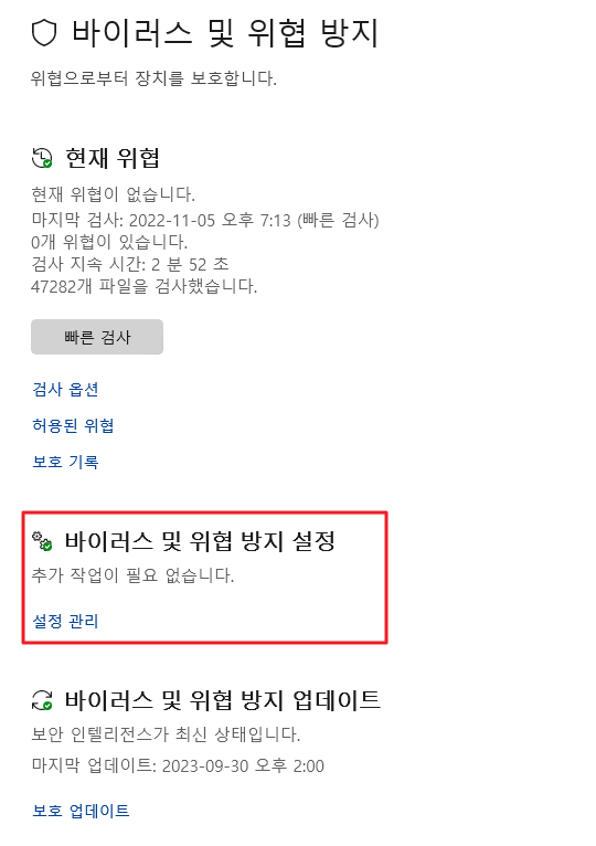 바이러스 및 위협 방지 설정의 설정관리를 클릭합니다.