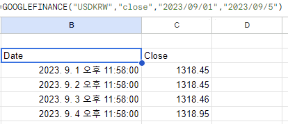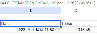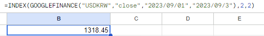 INDEX(GOOGLEFINANCE("USDKRW","close","2023/09/01"),2,2)