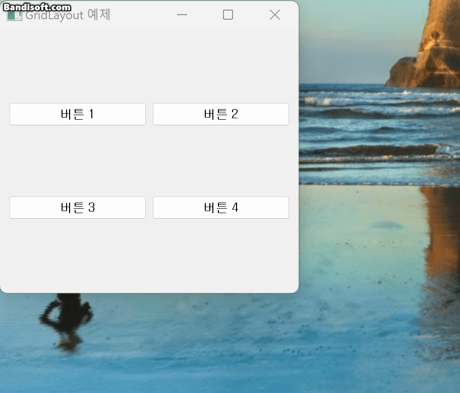 다음 예제는 버튼 4개를 만들어 GridLayout을 적용한 예제입니다.