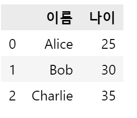 data = {'이름': ['Alice', 'Bob', 'Charlie'],