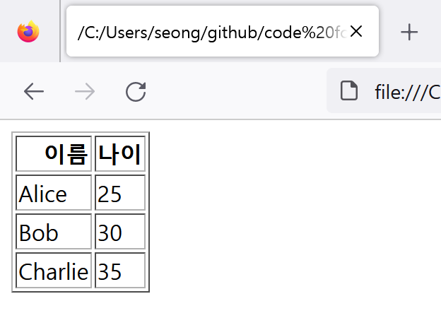 실제로 웹에 반영되는지 확인하겠습니다. 경로를 브라우저에 넣으면 다음과 같이 표로 생성되는 걸 볼 수 있습니다.