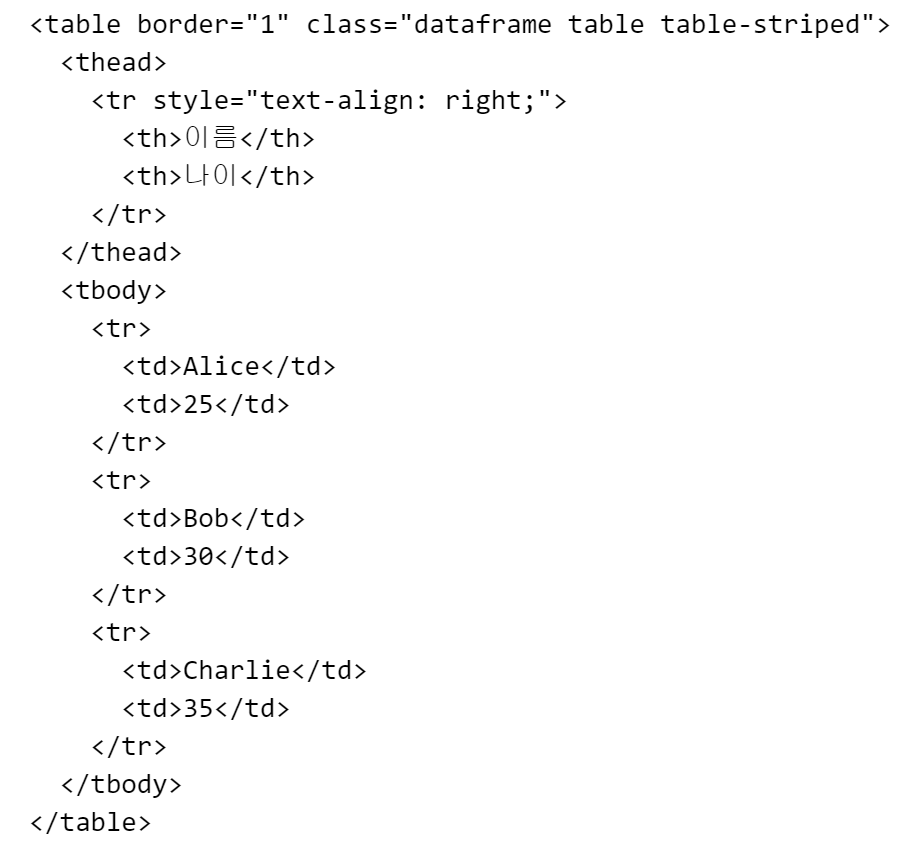 위 코드에서 index=False는 데이터프레임의 인덱스 열을 HTML 출력에서 제외하라는 옵션입니다. classes는 HTML 테이블에 CSS 클래스를 추가하는 옵션으로, 이를 통해 스타일을 적용할 수 있습니다.
