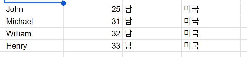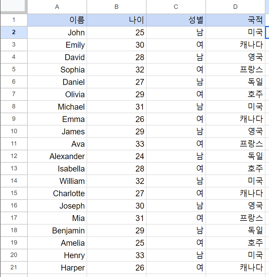 함수를 해봅시다. 특정 글자가 들어가는확인하는 함수인Regexmatch()를 써서 국적이 '미국'인 사람을 찾아보겠습니다.