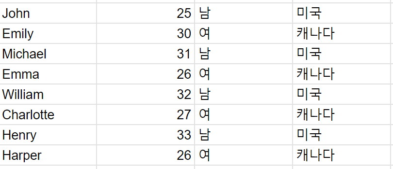 OR을 하려면 조건을 괄호로 구분한 후 +를 중간에 넣어주면 됩니다. OR을 이용해 국적이 미국이나 캐나다인 사람을 뽑아내겠습니다.
