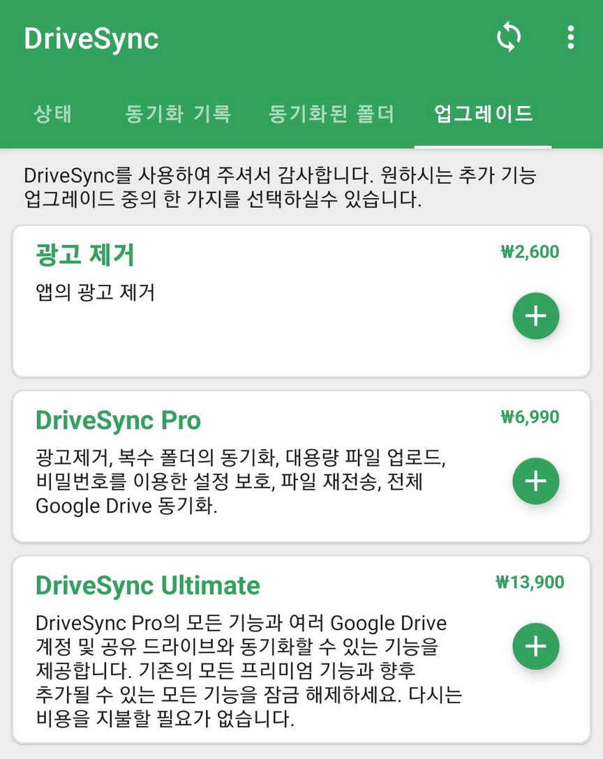 무료버전은 앱을 켜면 광고를 한번 봐야하고 1계정, 1폴더만 가능하다는 제약이 있습니다. 유료버전은 프로와 Ultimate 버전이 있는데 프로는 1계정에서 복수폴더, 광고제거가 가능하고 Ultimate는 프로버전 + 복수계정이 가능합니다. 한번만 지불하면 모든 장치에 적용됩니다. 매달 구독하는 것보다는 나을 것 같습니다.