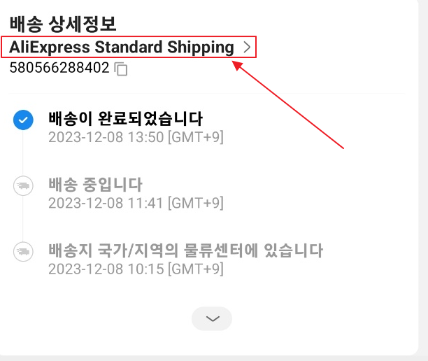배송내역이 나오는데 운송장 번호 위에 AliExpress Standard Shipping(배송방법에 따라 다를 수 있습니다.)을 누릅니다.