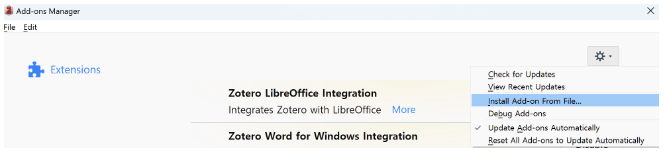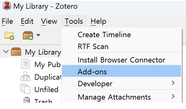 zotero 프로그램을 실행시켜주시고 Tools → Add-ons를 클릭해주세요
