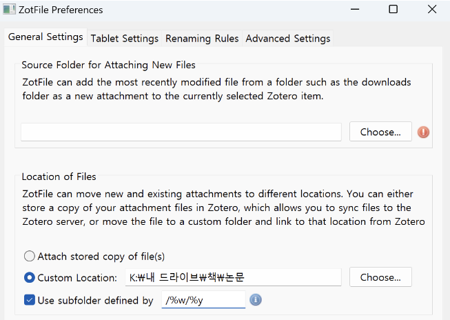 Use subfolder defined by 는 서브폴더를 어떤 형식으로 만들것인가인데 기호에 따라서 저널출판사, 저자이름, 논문제목 등으로 만들 수 있습니다. 이에 대한 룰은 아래를 참고해주세요.