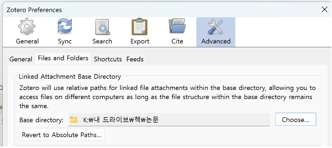 Custom Location을 체크하면 폴더선택창이 뜨는데 거기서 구글드라이브에서 논문을 넣을 폴더를 선택합니다.