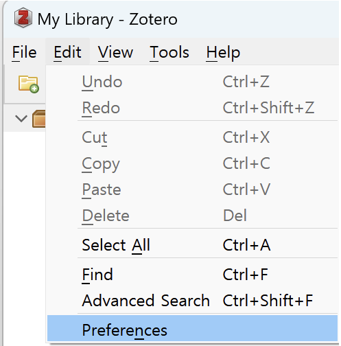 이번에는 Zotero에서 폴더연결을 해줍니다. Edit - Preferences를 들어갑니다.