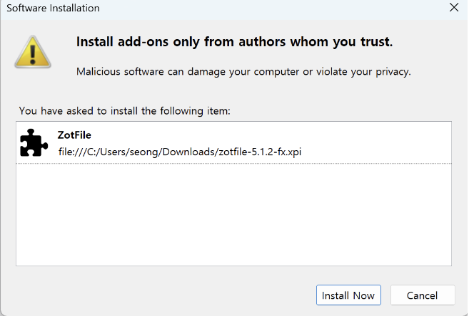 zotfile 홈페이지에서 다운 받았던 파일을 선택합니다.