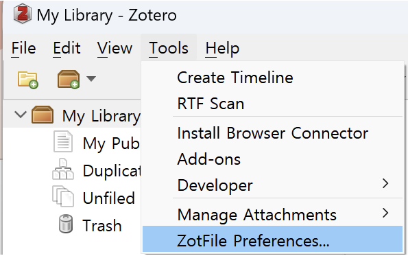 먼저 Zotfile에서 폴더 연결을 하겠습니다.Tools에 가보면 Zotfile preferences 이라는 것이 생깁니다. 클릭해 들어갑니다.