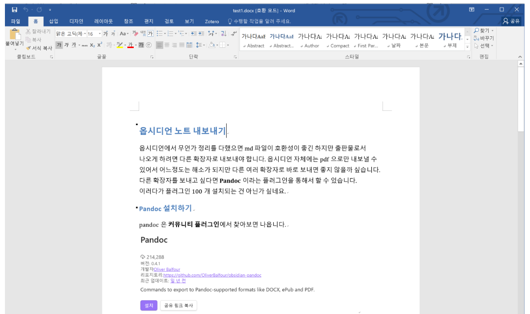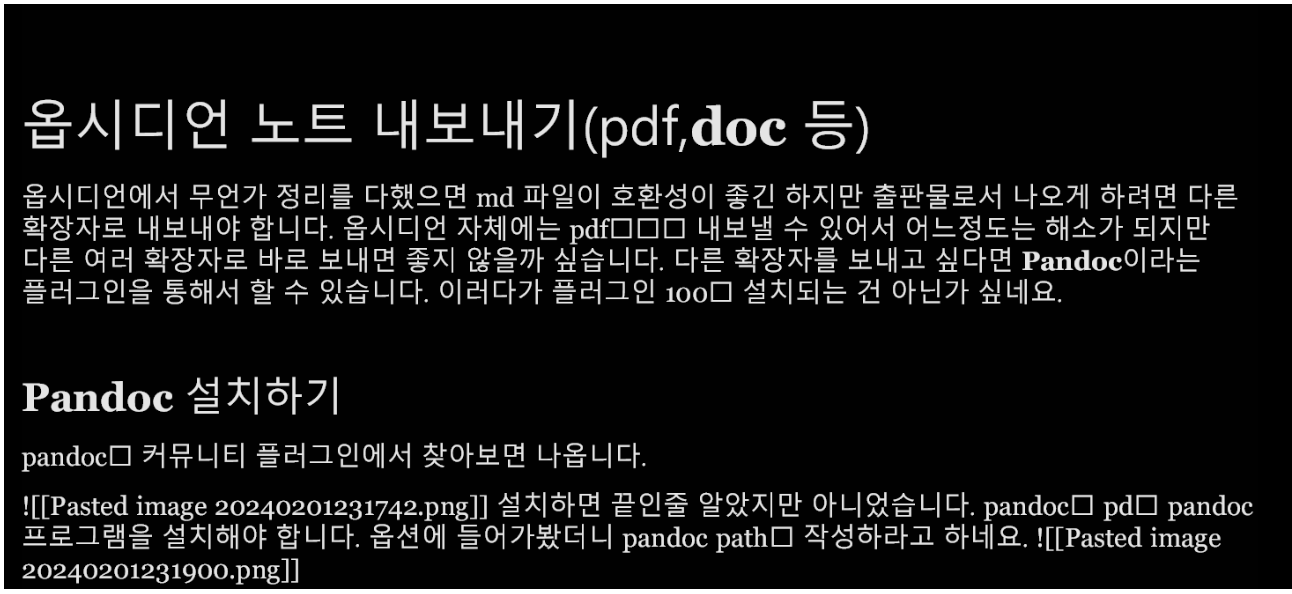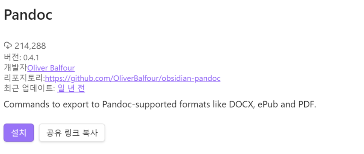 옵시디언에서 무언가 정리를 다했으면 md 파일이 호환성이 좋긴 하지만 출판물로서 나오게 하려면 다른 확장자로 내보내야 합니다. 옵시디언 자체에는 pdf으로만 내보낼 수 있어서 어느정도는 해소가 되지만 다른 여러 확장자로 바로 보내면 좋지 않을까 싶습니다. 다른 확장자를 보내고 싶다면 Pandoc이라는 플러그인을 통해서 할 수 있습니다. 이러다가 플러그인 100개 설치되는 건 아닌가 싶네요.