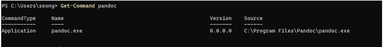 설치를 하면 경로가 안나옵니다. 옵션에도 써져있습니다만 경로는 윈도우 사용자라면 powershell에서 Get-Command pandoc을 쳐서 알아냅니다. 탐색기에서 pandoc을 검색해서 경로를 알아내도 됩니다.