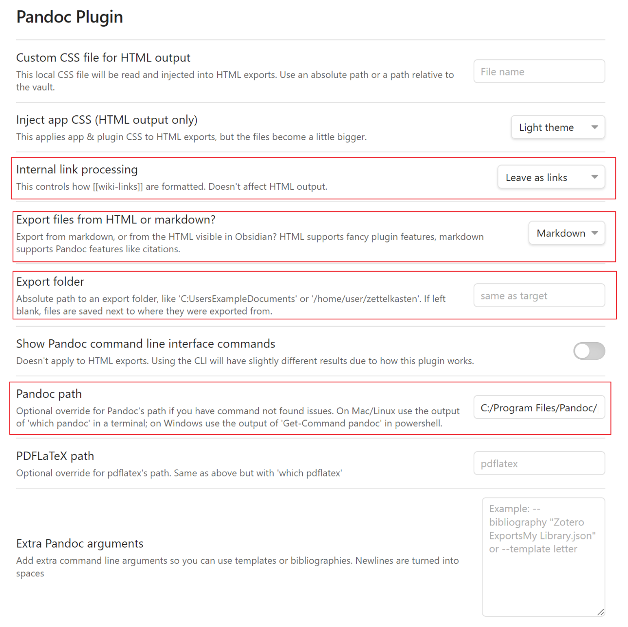 필수적으로 Internal link processing(내부링크), Export folder, Export files fro HTML or markdown 를 설정해주어야 합니다.