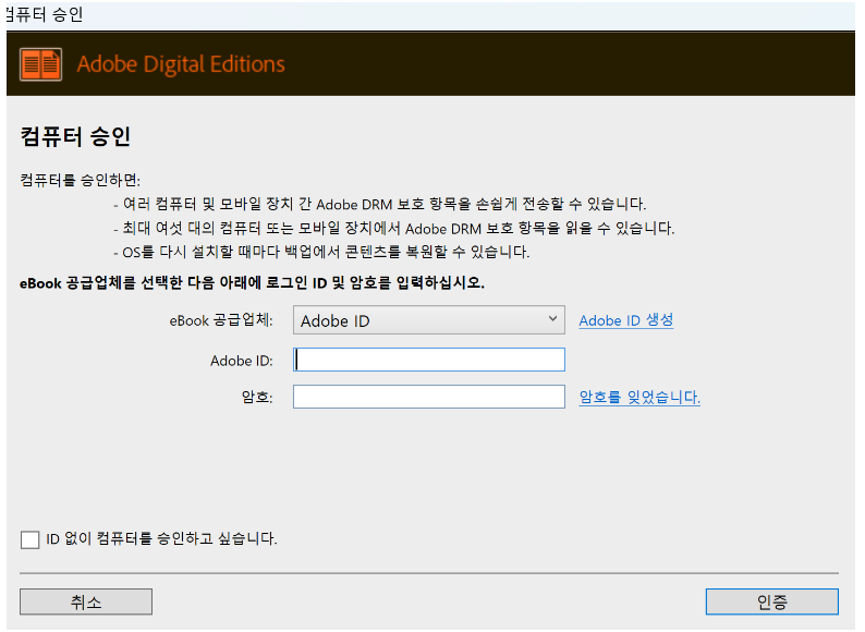 추가하는 과정에서 컴퓨터 승인을 위해 로그인을 하라고 합니다. 안해도 될 것 같긴 하지만 나중에 에러가 날 수 있으니 Adobe ID가 있다면 로그인을 하시는걸 추천드립니다.