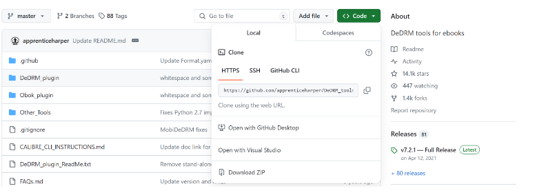 epub으로 바뀌었지만 암호화되어 있습니다. DRM을 풀겠습니다. 다음 github 사이트에 가서 dedrm 플러그인을 받습니다.