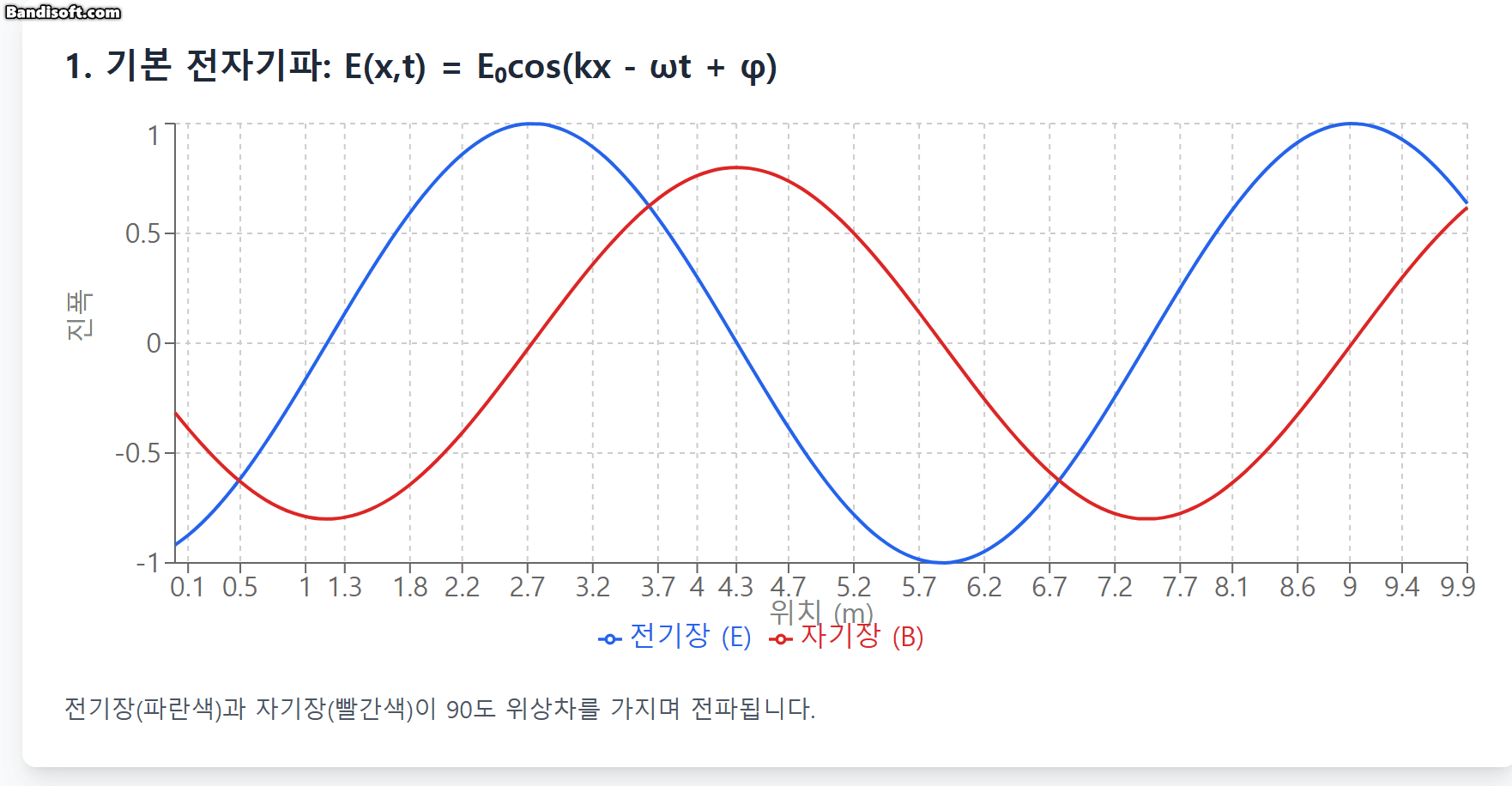 전자기파는 시간과 공간에 따라 진동하는 전기장과 자기장으로 구성됩니다. 가장 간단한 평면파의 경우, 전기장은 다음과 같이 표현됩니다: