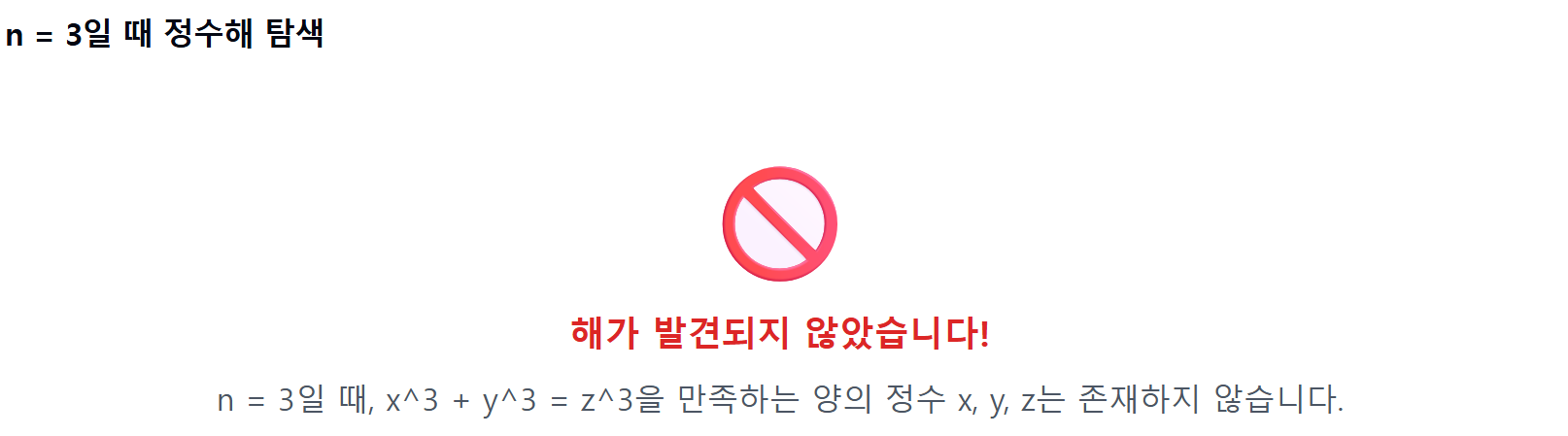 "$n > 2$ 인 자연수일 때, $x^n + y^n = z^n$을 만족하는 양의 정수 해 x, y, z는 존재하지 않는다."
