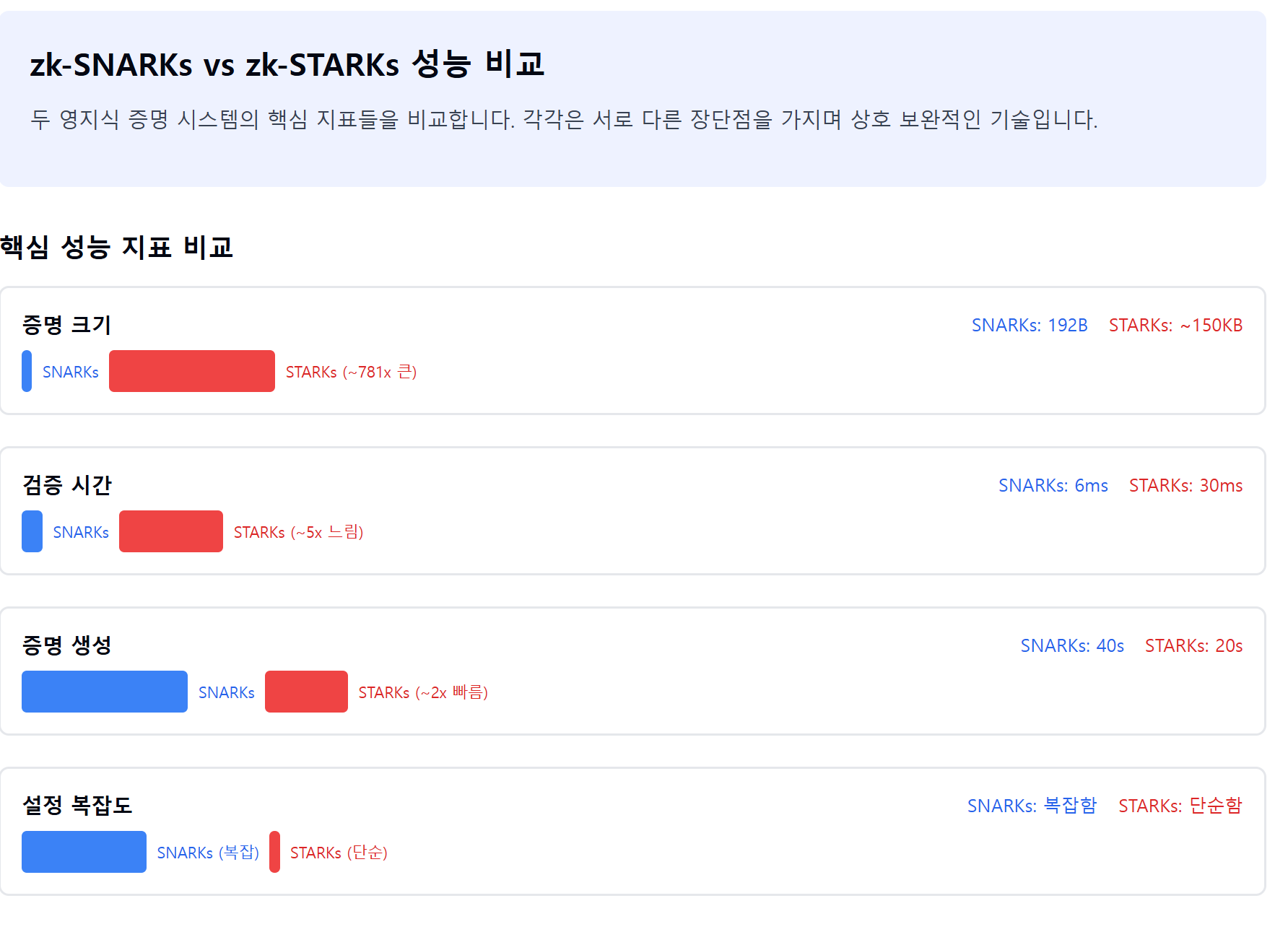 zk-STARKs와 zk-SNARKs는 서로 다른 장단점을 가진 상호 보완적 기술입니다. SNARKs는 작은 증명 크기와 빠른 검증으로 즉시 응답이 필요한 응용에 적합하고, STARKs는 투명성과 확장성으로 대규모 시스템과 장기적 보안이 중요한 응용에 적합합니다.